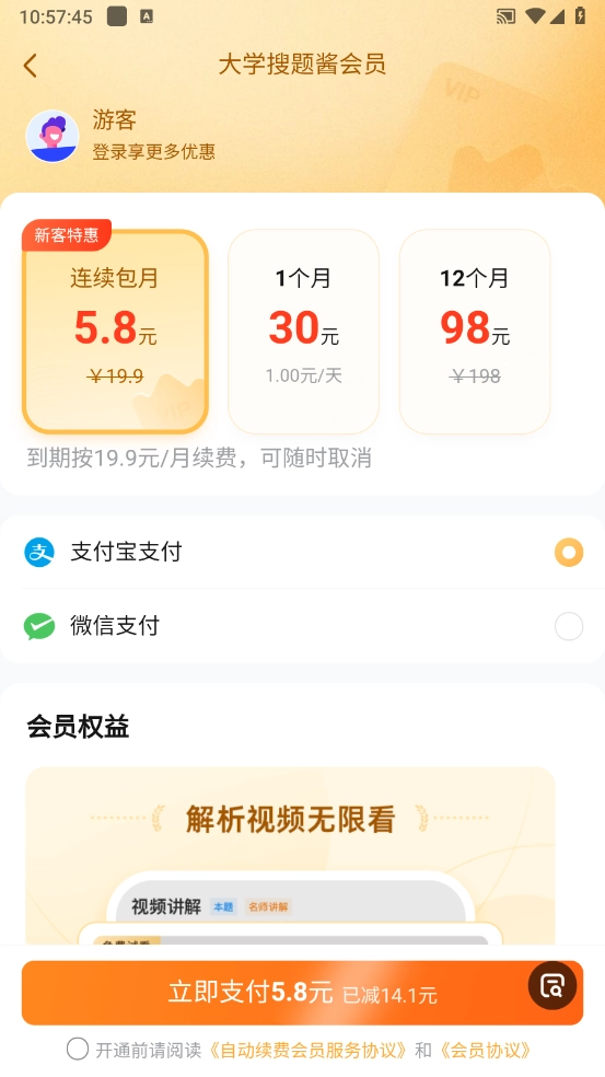 1、支付宝支付用户:打开支付宝"我的"界面,点击右上角【设置】→点击【支付设置】选项 →点击【免密支付/自动扣款】→选择大学搜题酱项目,点击【关闭服务】即可解除大学搜题酱的自动续费服务。