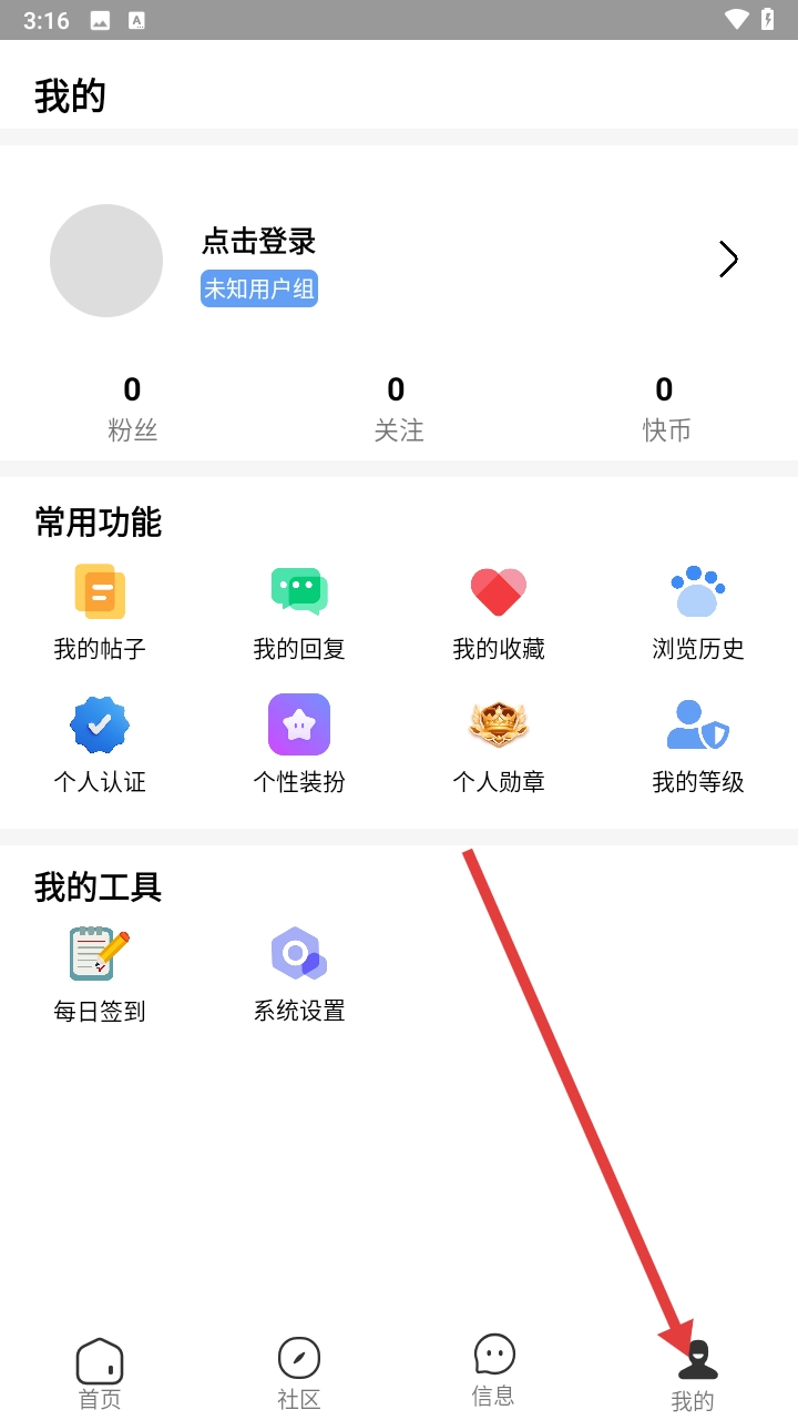 1、进入快发社区之后,点击右下角“我的”。
