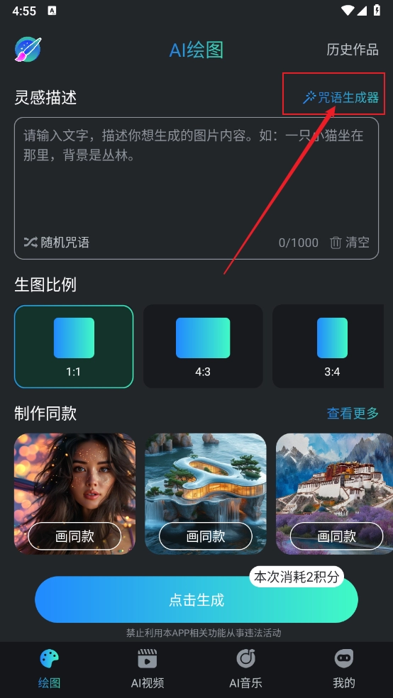 1、拥有功能强大的咒语生成器,可以根据用户的需求生成精确的绘图指令,帮助用户更有效地向AI表达创作想法。