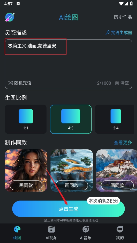 4、如图所示,已自动添加至灵感描述,选择比例、生成的数量等,底部点击生成即可。