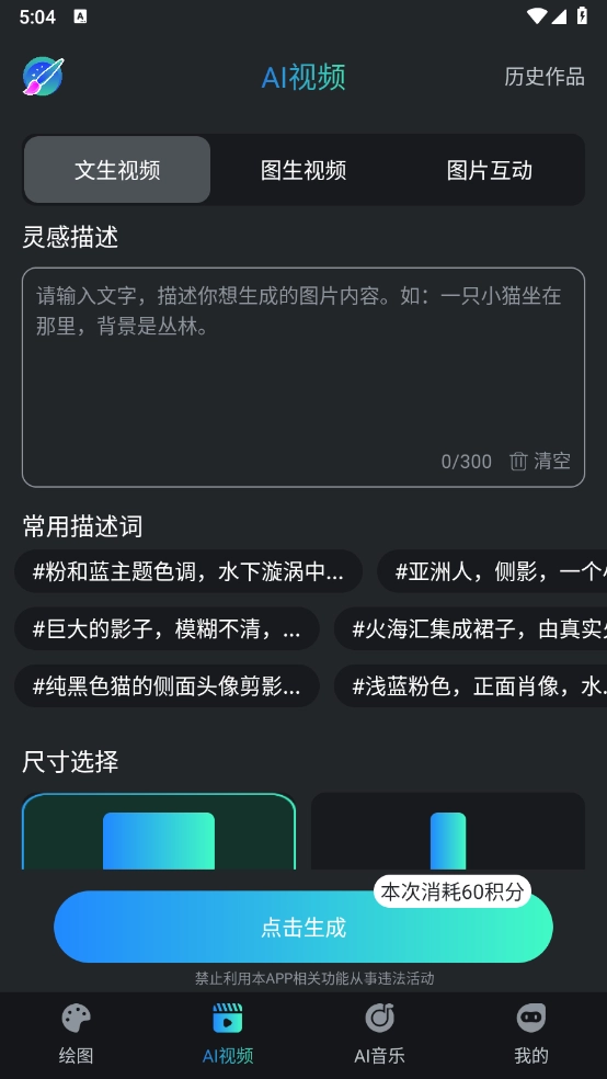 AI千绘,带来功能强大的绘画、视频和音乐编辑工具,提供了丰富的漫画自动生成功能,能够在里面根据个人喜好选择主题模板来创作画作,支持音乐编辑和视频内容创作等多种功能,只需要输入关键词就能进行绘图哟!