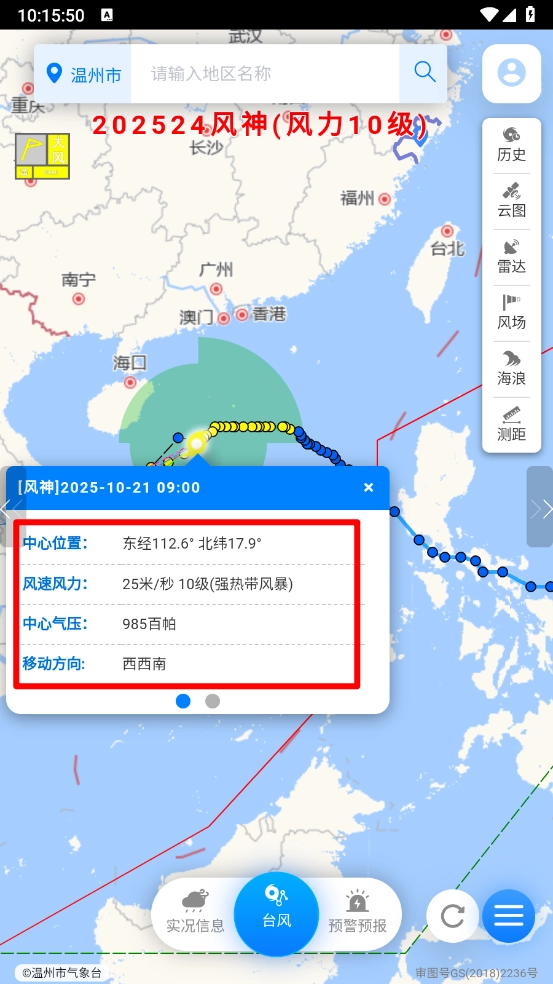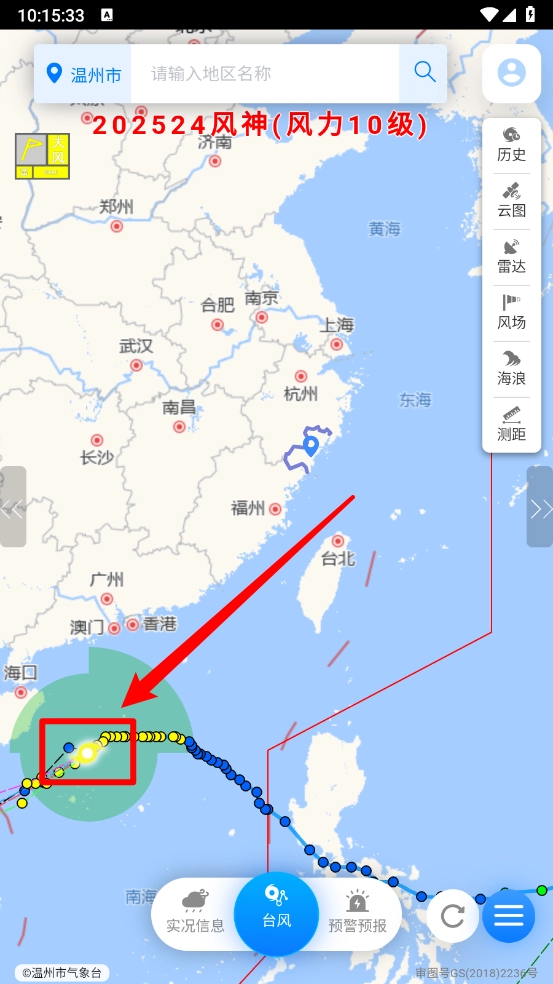 启动应用后,轻点“实时台风”模块,就能直观查看台风的行进轨迹,了解它的移动速度和方向。