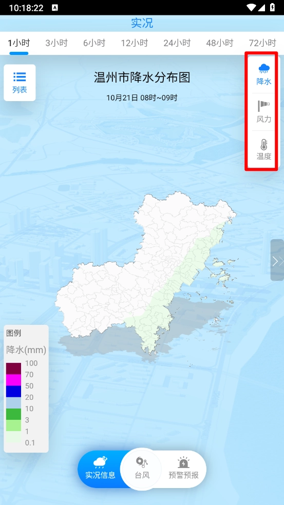 5、切换到“实况信息”页面,就能查看气温、降水、风力等信息。