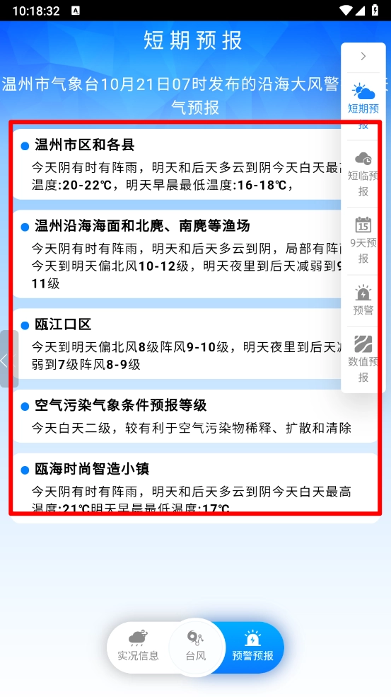 6、最后,用户还能在“预警预报”页面查看每日发布的警报信息与天气预报。