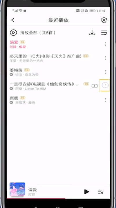2、找到你想设为来电铃声的歌曲,点击歌曲旁边的菜单按钮