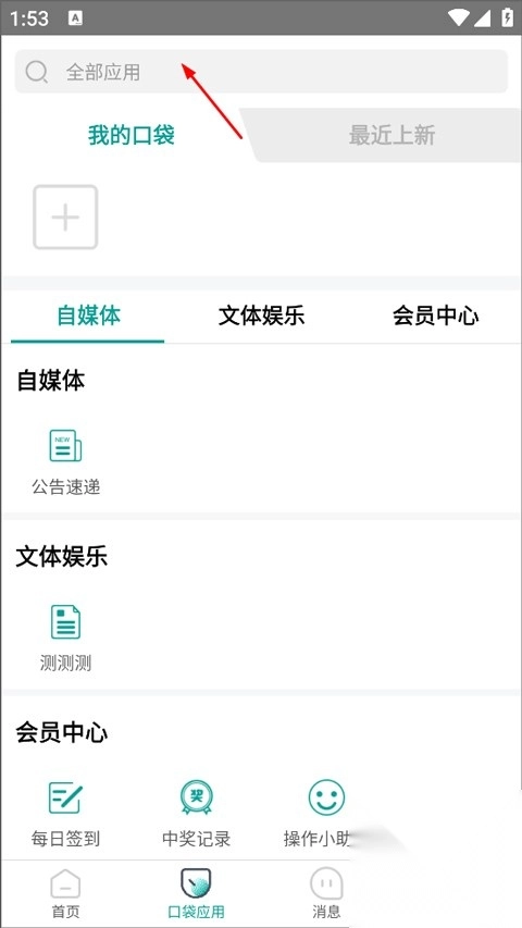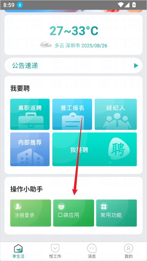 1、用户打开爱口袋App并登录进入首页,在首页有操作小助手,点击口袋应用;