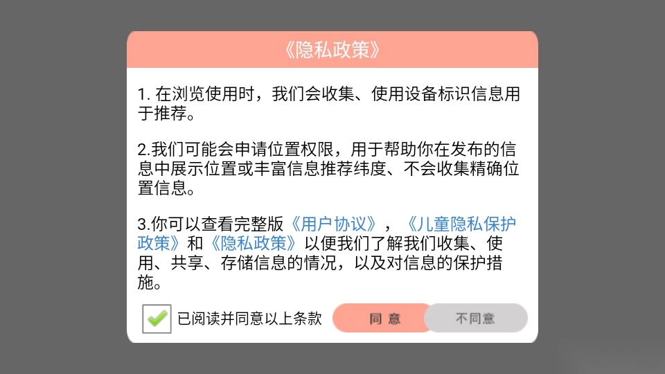 1.首先打开软件阅读“隐私政策”后,点击“同意”按钮进入