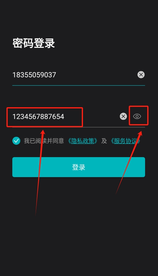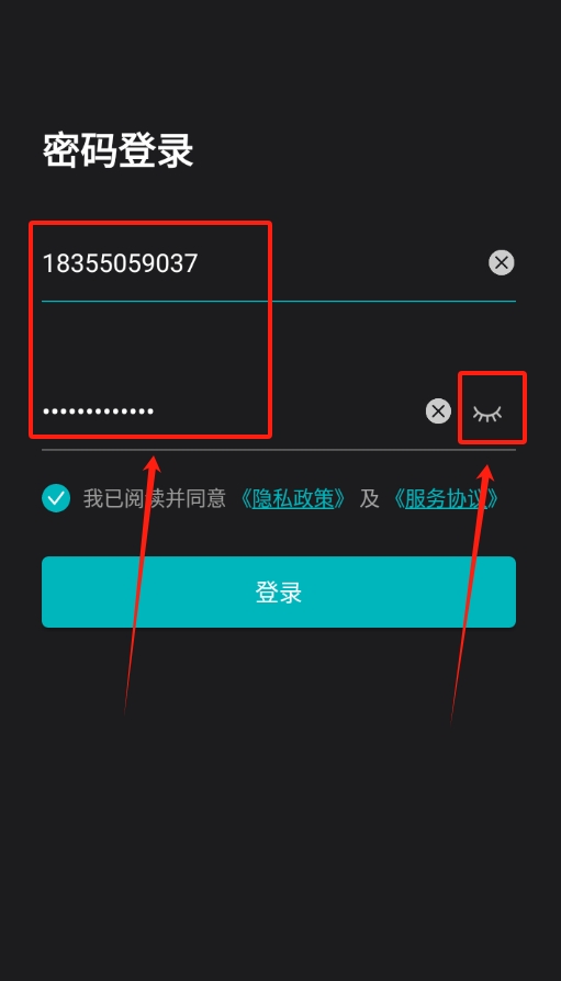 2、进入登录页面后,输入个人账号与密码,接着点击界面上显示为闭眼状态的眼睛图标。
