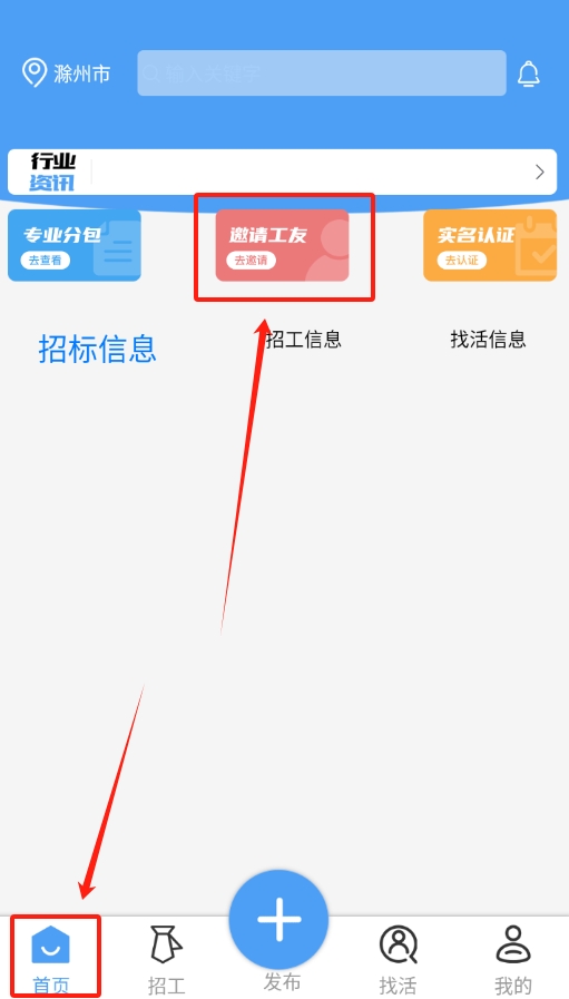3、登录成功返回首页后,找到“邀请工友”按钮,点击该按钮即可将其分享给身边的工友。