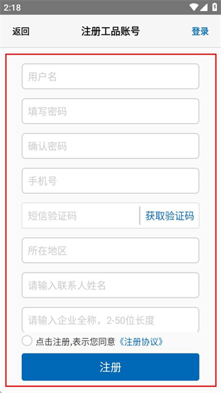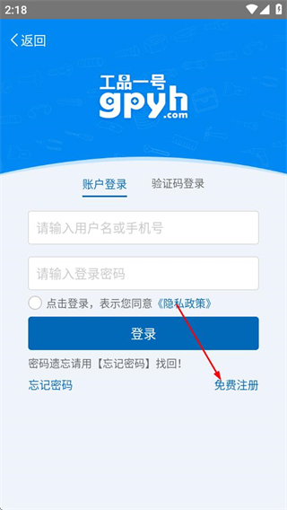 3在登录界面,选择免费注册入口,跳转至工品账号的注册页面。