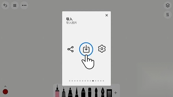 10、需要导入图片进行创作时,点击左上角的三个点,会出现图片图标,点击后跳转到设备管理器,选择一张图片并点击,图片就会自动导入,稍作等待后图片会出现在图层中。之后还可以滑动屏幕调整图片位置,确认位置合适后点击右上角的勾即可。