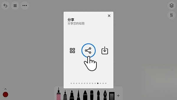 11、当完成一个作品后想要分享出去时,同样点击左上角的三个点,此时会出现图片里的图标,点击该图标后会弹出选项,我们可以从中选择PNG、JPG格式或者Sketches绘图格式进行导出。