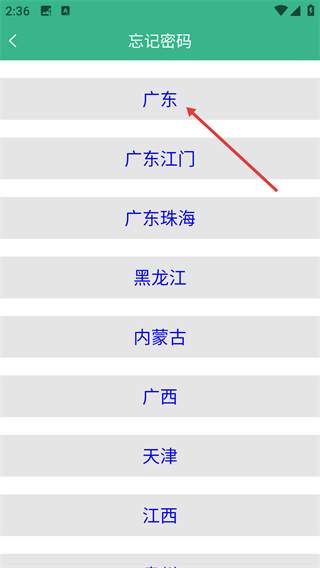 3、在忘记密码的地区列表里点击【广东】这一选项,就能进入该地区对应的找回密码信息填写页面。