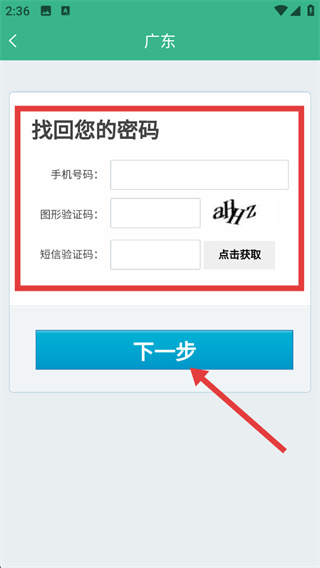 4、在密码找回页面依次填写手机号码、图形验证码和短信验证码,之后点击【下一步】按钮,即可继续推进密码找回的流程。