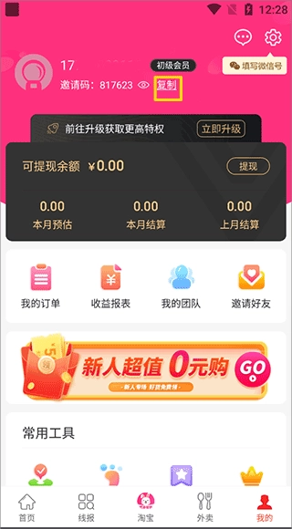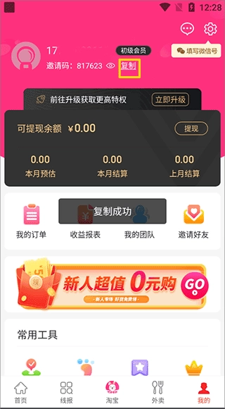 二、邀请码的获取1、启动软件后,在“我的”页面里找到黄色方框中的“复制”按钮并点击它;
