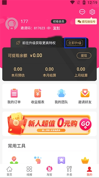 一、会员等级提升方法 1、启动软件后,进入“我的”页面,找到并点击蓝色方框中的“立即升级”按钮;