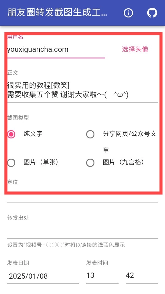 3、随后可自行选择截图类型、转发出处、发表日期、截图日期等相关参数。