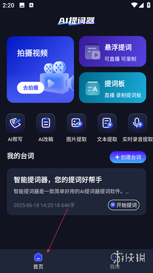 3、应用首页整合了智能提词的核心功能区域,涵盖视频拍摄、悬浮提词等快捷入口,还配备了AI文案创作、图片文字识别等实用工具,并且设有专属的台词管理模块。底部导航栏的设计简洁清晰,包含“首页”与“个人中心”两个主要功能入口。