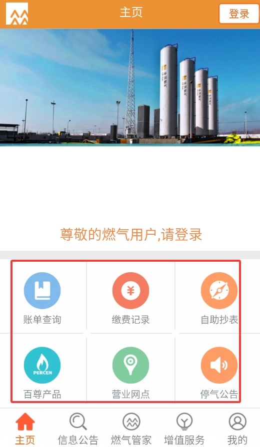 2、主页设有账单查询、自助抄表、营业网点查询以及百尊产品购买等功能的入口。