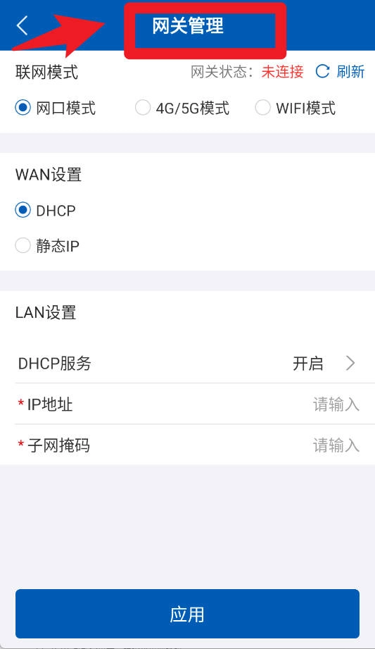 2、点选离线配置进入网关管理界面,可以选择网口、4G/5G或WiFi模式,支持DHCP和静态IP配置,灵活管理网络连接。