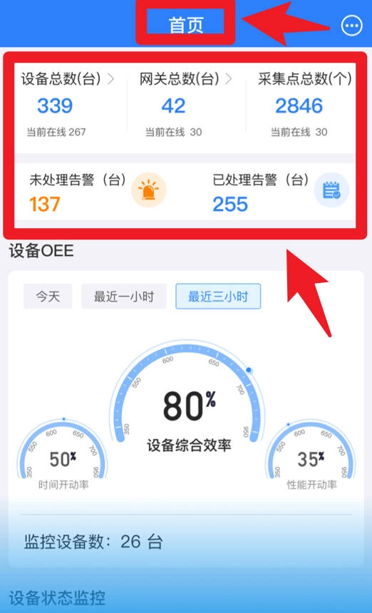 3、在首页中可查看设备总数、网关数及采集点情况,并实时显示告警数量与处理情况,便于快速掌握运行状态。