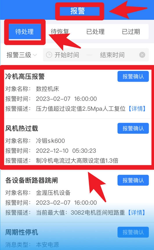 4、在报警模块,用户可以查看待处理报警详情,确保及时响应和处理异常,帮助用户高效管理。