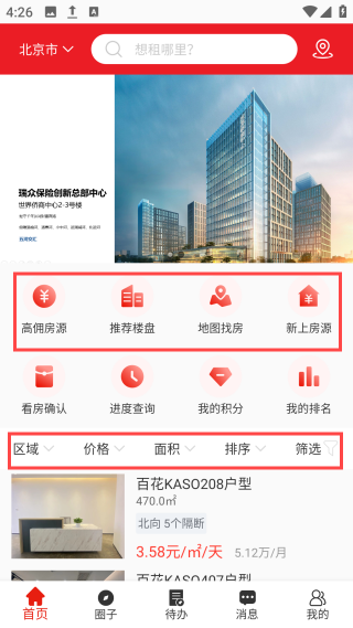 3、进入首页后,可通过浏览分类板块或设置相关筛选条件,来挑选出符合需求的房源。