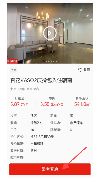 4、挑选合适的房源,查看其详细介绍后,点击【带客看房】按钮进行预约。