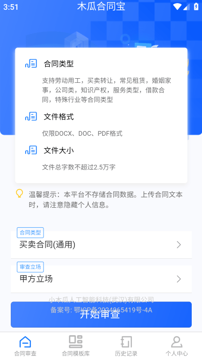 进入后,你可以在此选择合同类型与审查立场,随后上传合同文件即可启动审查流程。