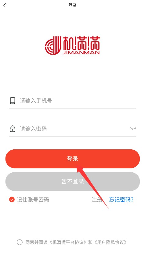 1、启动机满满应用,输入用于注册的手机号和密码,勾选用户协议后点击登录按钮,即可进入主界面。