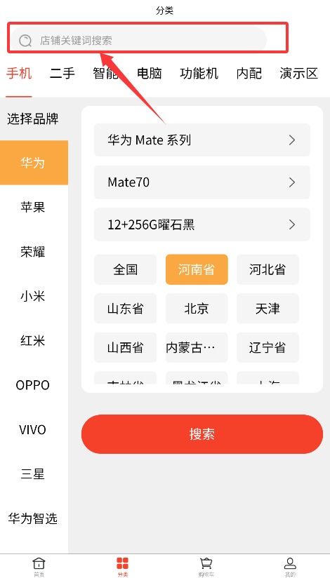 2、在分类页面,你可以通过搜索栏输入店铺名称来查找目标商家,也能直接浏览推荐品牌列表进行查找。