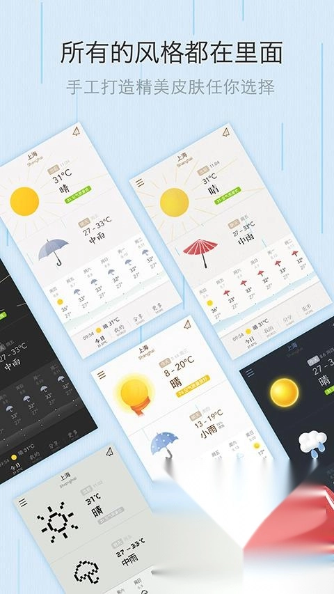 1、“我的天气”为用户配备了宇宙、唐风、比特等各类主题,还支持依据亮度感应自动更换主题以及设置随机主题的功能。