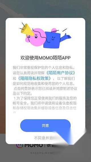 1、安装陌陌,进入软件之后需要同意用户协议;