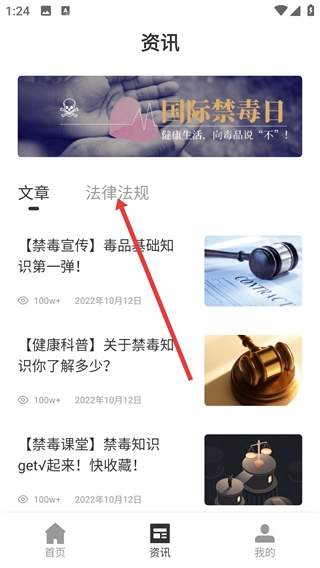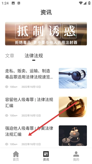 2、在资讯页面,点击【法律法规】,切换到法律法规列表,可浏览各类禁毒相关法律法规文章。