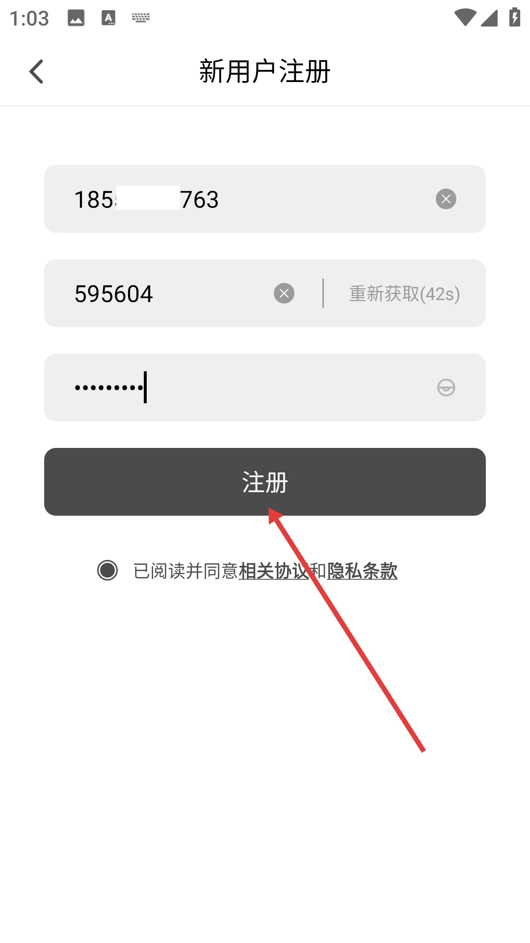 4、在输入验证码与密码之后,点击【注册】按钮,即可完成新用户的注册流程。