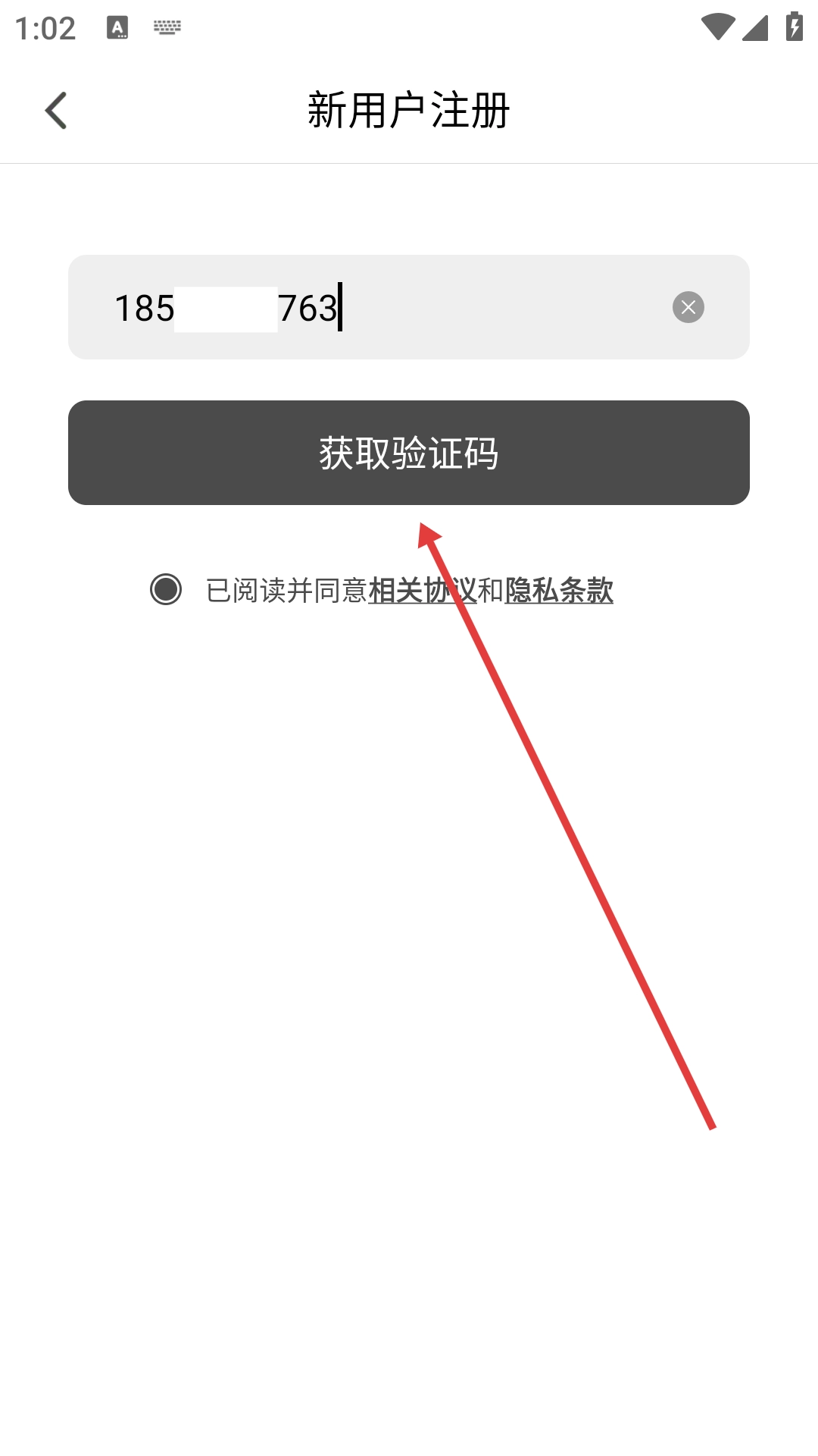 3、在新用户注册页面填写手机号,随后点击【获取验证码】按钮,获取验证码并完成输入操作。