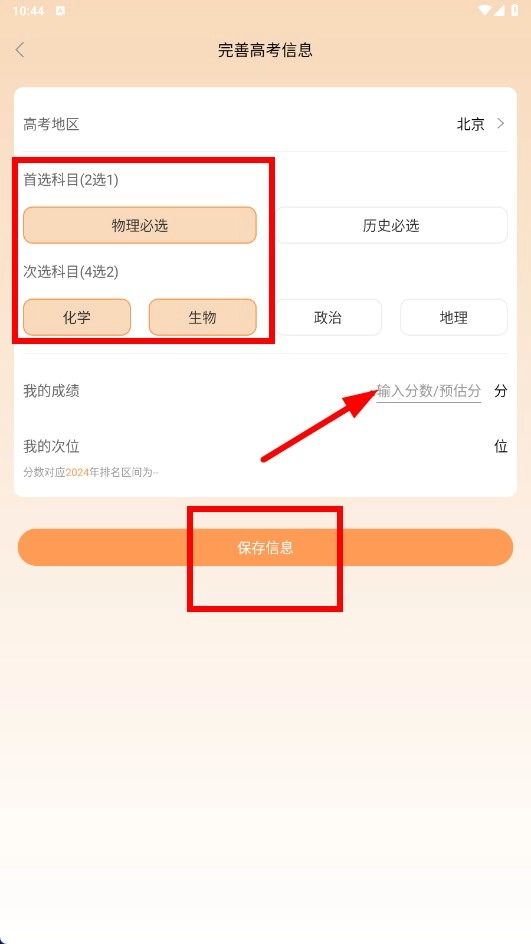 2、完善页面操作时,比如选择【物理必选】-【化学】-【生物】这一组合,输入分数后点击【保存信息】按钮,即可完成高考信息的完善。