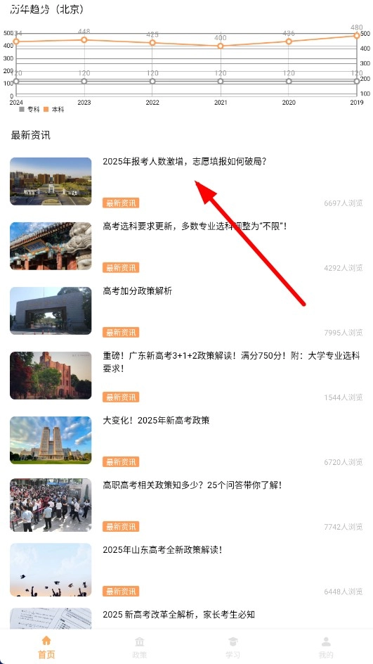 4、在首页资讯板块,点击如【2025年报考人数激增…】这类资讯标题,即可查看高考政策、志愿填报等相关详细内容。