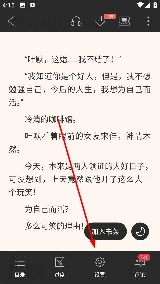 2、进入小说阅读页面后,点击【设置】按钮,即可展开阅读设置相关选项。