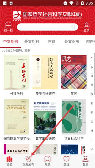 1、在国家哲学社会科学文献中心首页,点击底部【优先发布】,进入优先发布板块。