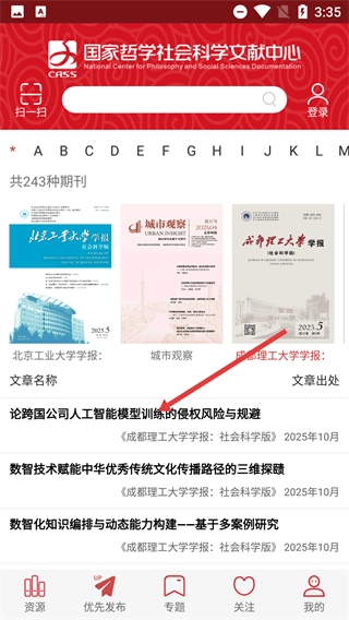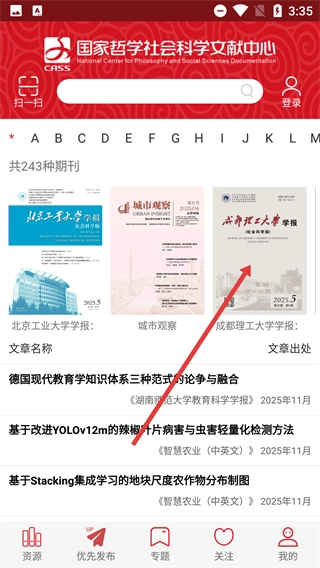 2、在优先发布板块,选择感兴趣的期刊如【成都理工大学学报】,进入该期刊的文章列表页。
