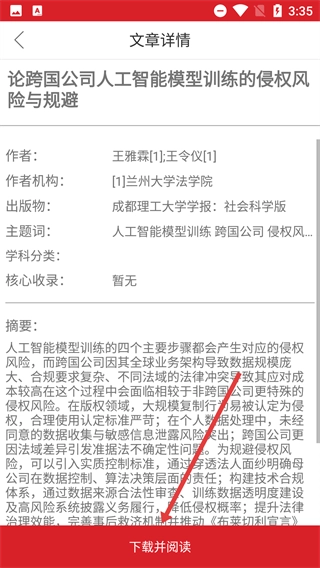 3、在文章列表页,点击具体文章如【论跨国公司人工智能模型训练的侵权风险与规避】,进入文章详情页。