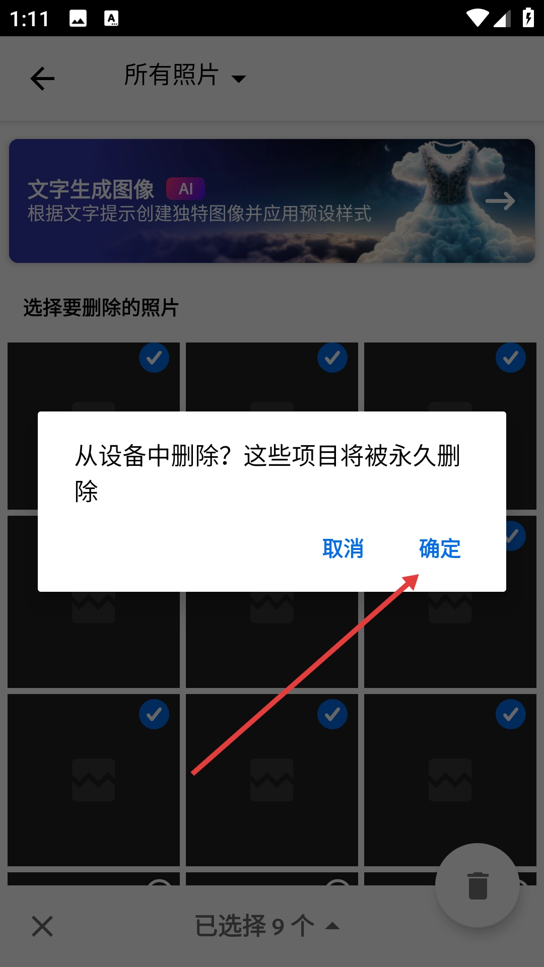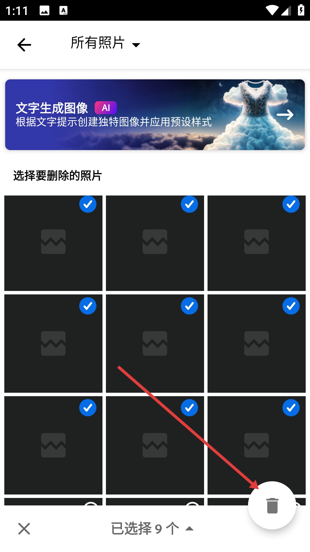 2、在所有照片页面点击【删除图像】,进入选择要删除的照片页面。