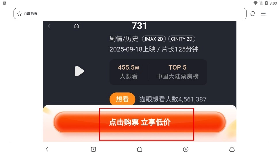 4、点击【点击购票立享低价-功能按钮】,可进行电影购票操作。