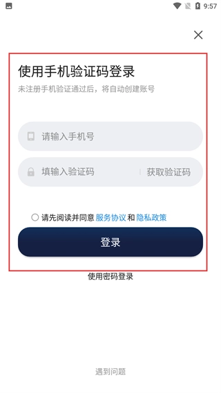 4、进入手机验证码登录页面后,先输入手机号并获取验证码,接着勾选同意服务协议与隐私政策,最后点击登录按钮,就能完成整个操作流程。