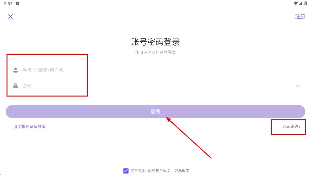 3、您也可以选择账号密码登录方式,输入对应的账号与密码后,点击【登录-功能按钮】即可完成登录;要是您忘记了密码,点击【忘记密码-功能按钮】就能进行找回操作。