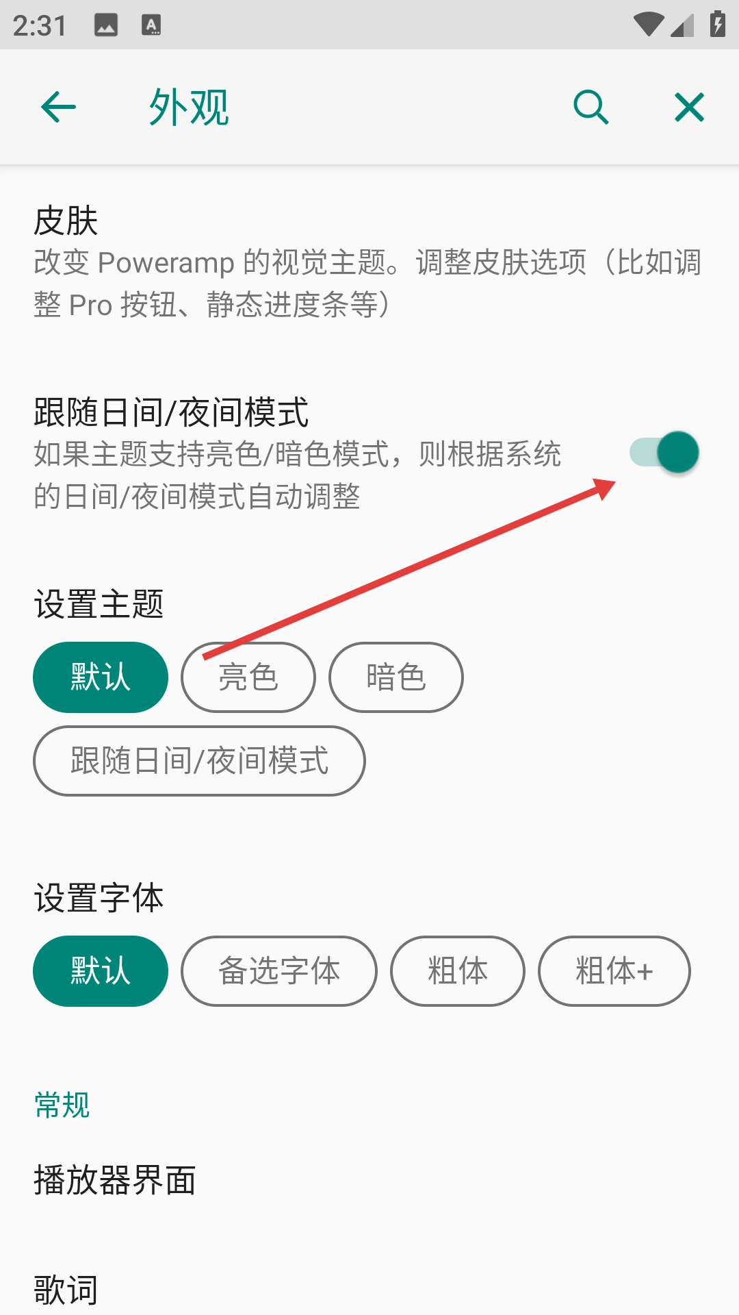 3、在外观设置页面可开启【跟随日间/夜间模式】功能,使主题根据系统模式自动调整。
