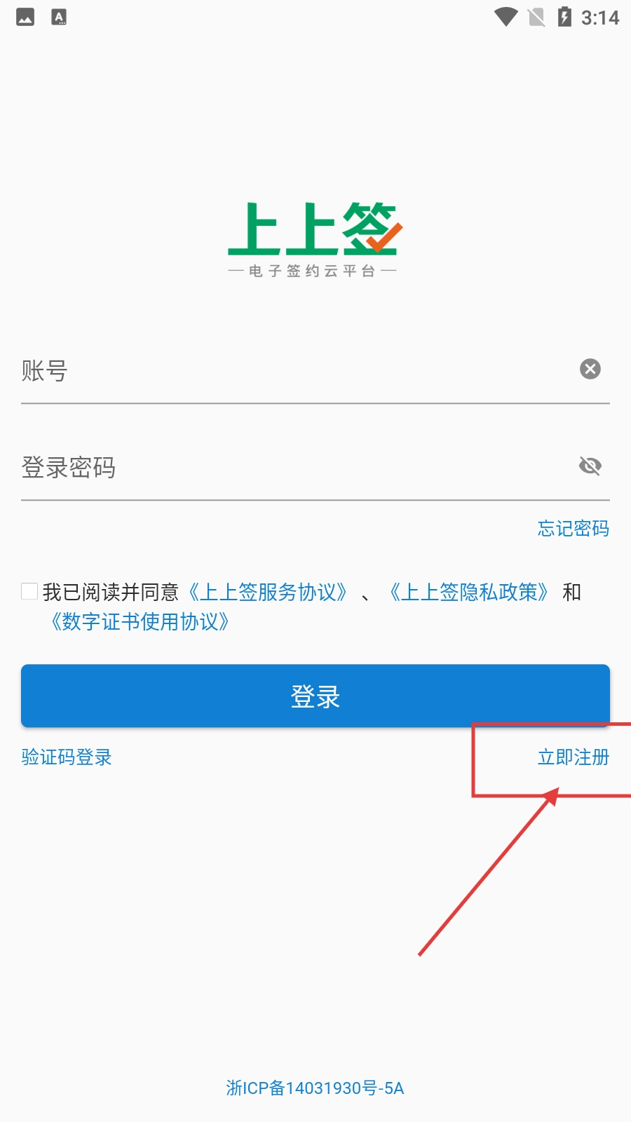 1、在【上上签】登录界面,若要注册账号,点击【立即注册】按钮即可进入注册流程。