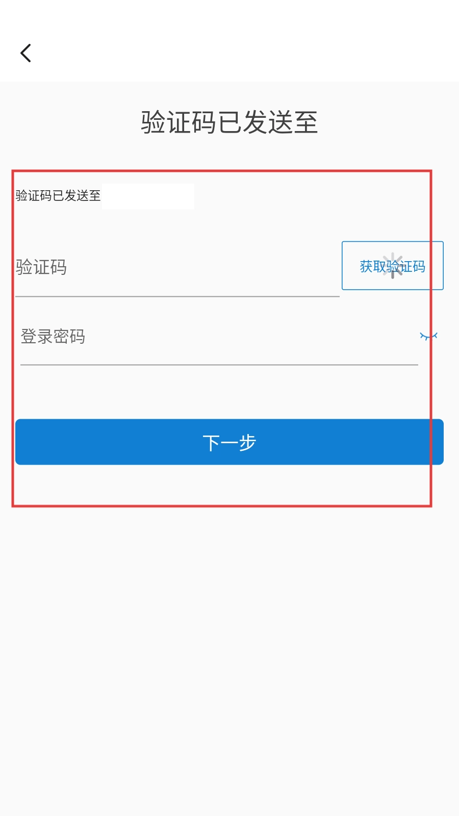 4、进行注册操作时,在验证码对应的界面中输入接收到的验证码,设置好登录密码后,点击【下一步】按钮,即可完成整个注册流程。