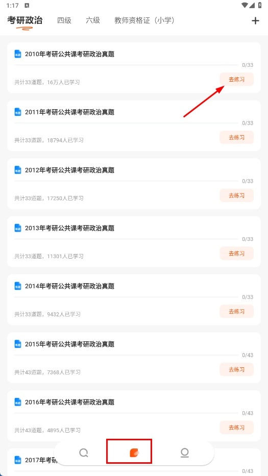 4、点击底部中间的功能按钮,进入包含考研政治在内的各类题库页面,选择真题后,点击【去练习】功能按钮开始练习。